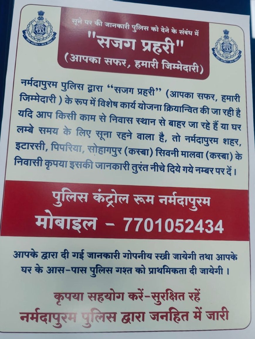 नर्मदापुरम। जिले में सूने घरों में बढ़ रही चोरी एवं गृह-भेदन की घटनाओं पर प्रभावी नियंत्रण के उद्देश्य से नर्मदापुरम पुलिस द्वारा एक सराहनीय और अभिनव पहल के रूप में विशेष कार्य योजना “सजग प्रहरी” (आपका सफर हमारी जिम्मेदारी) प्रारंभ की गई है।
